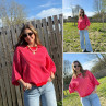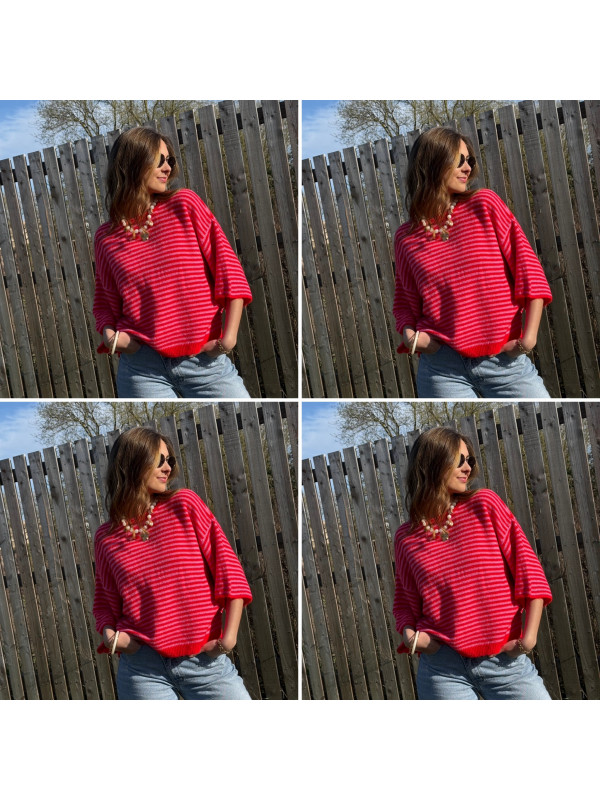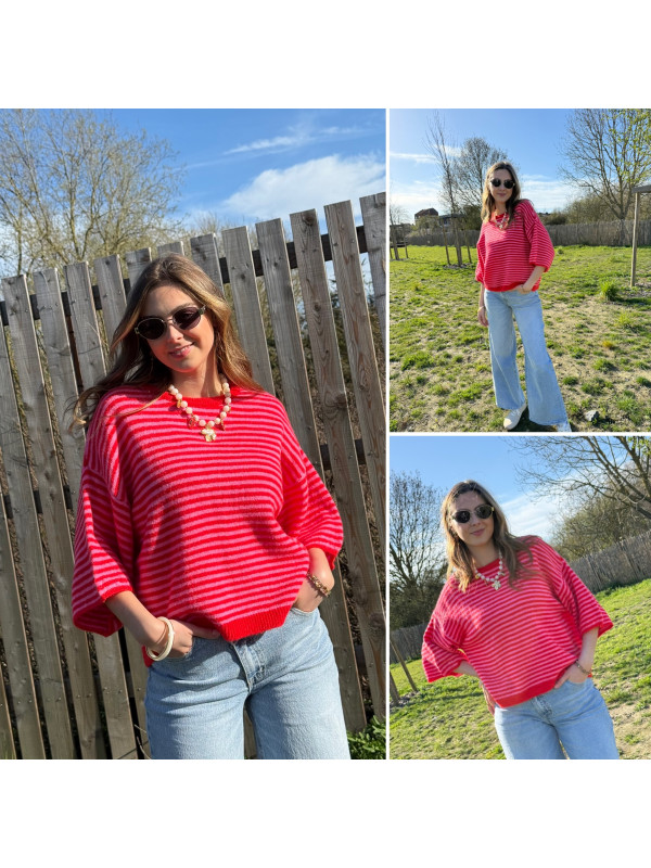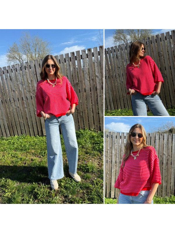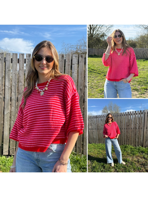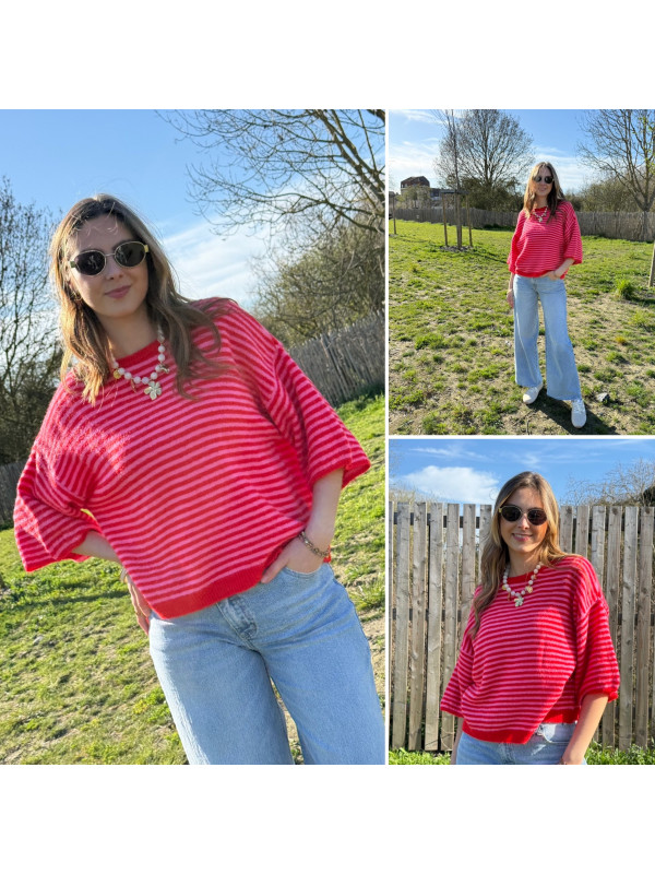 Pull manches courtes rayé rose et rouge