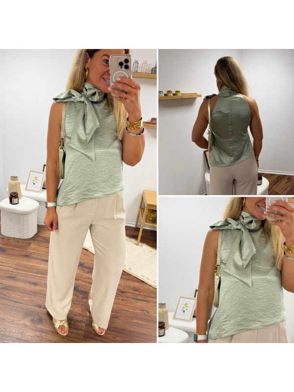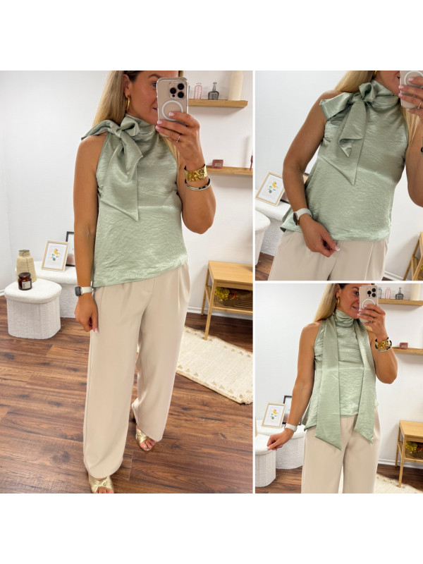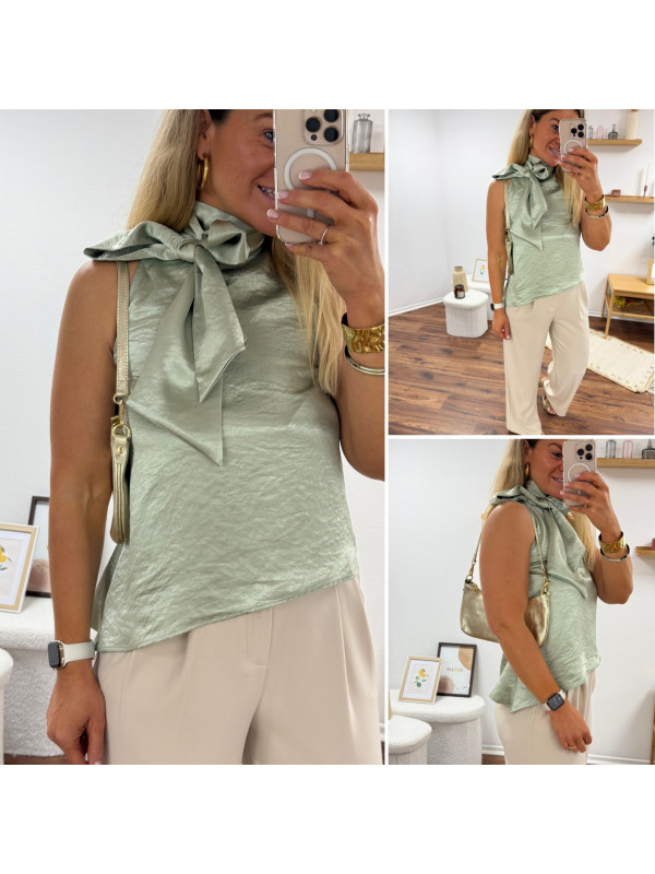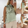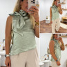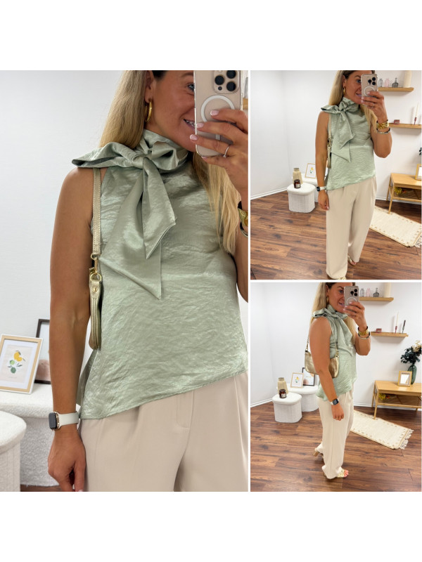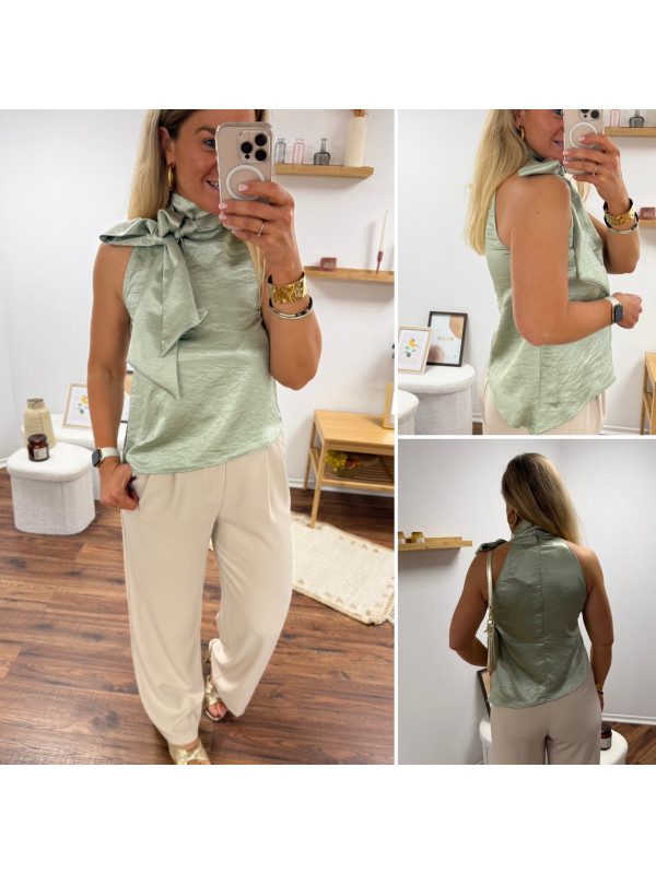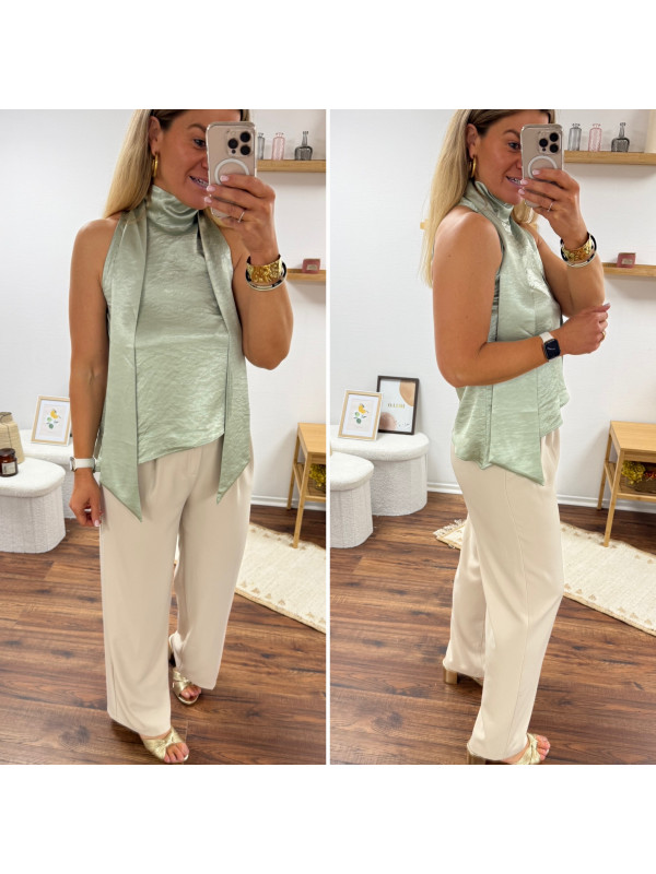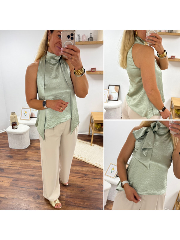 Top satiné vert d'eau avec lien à nouer au col