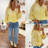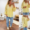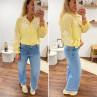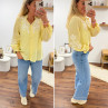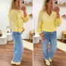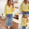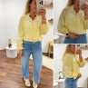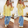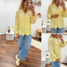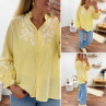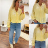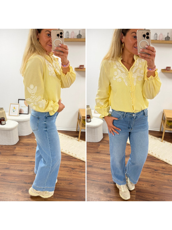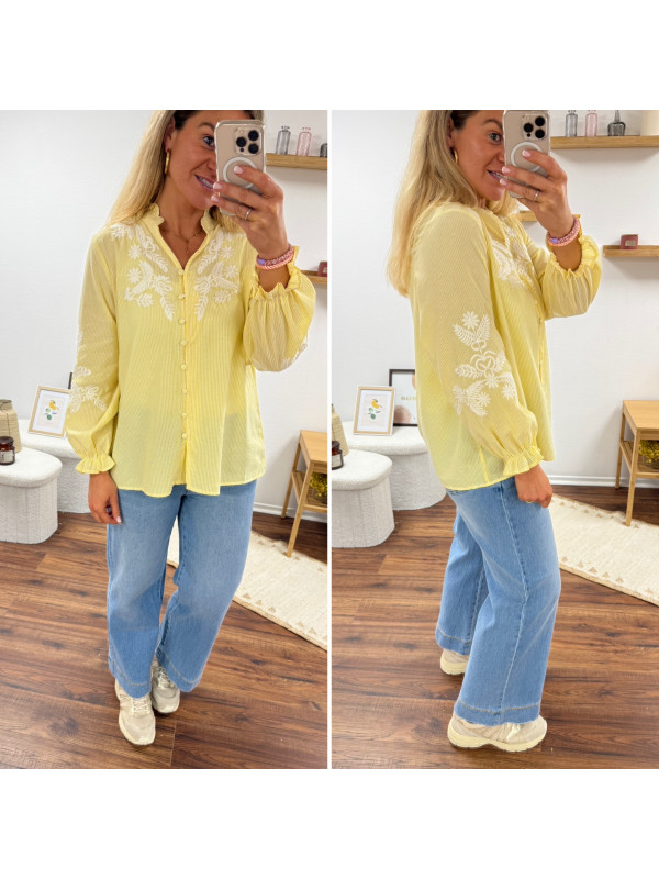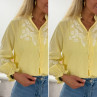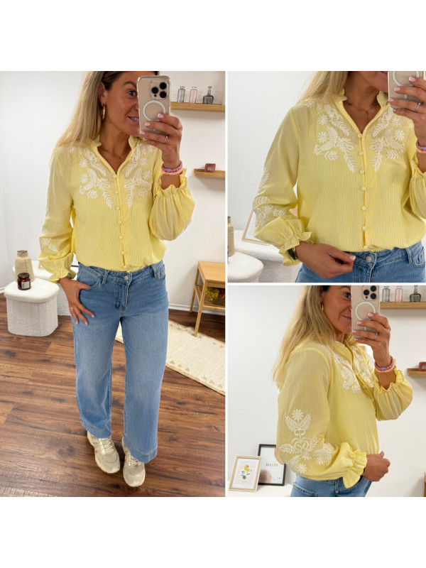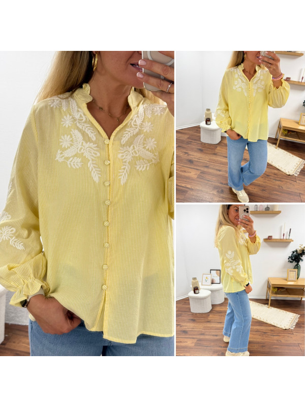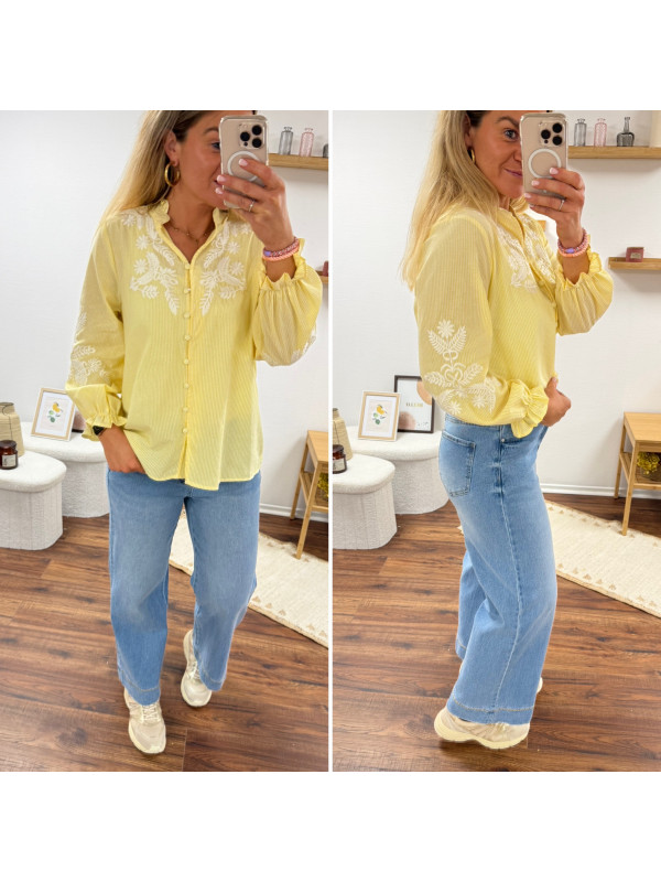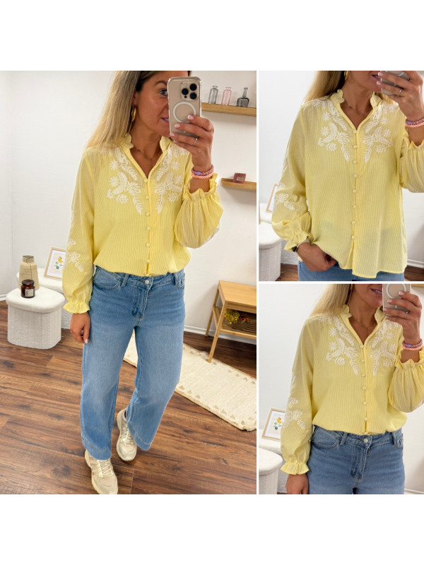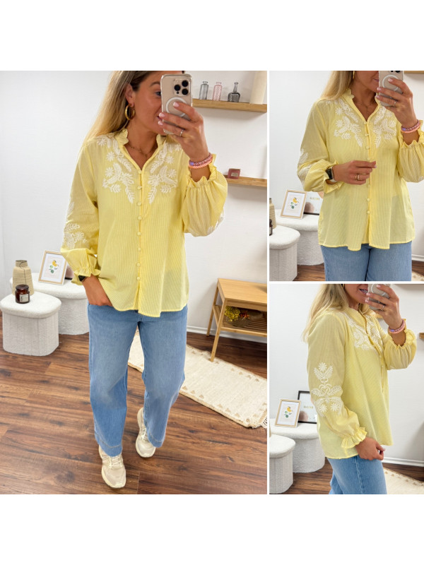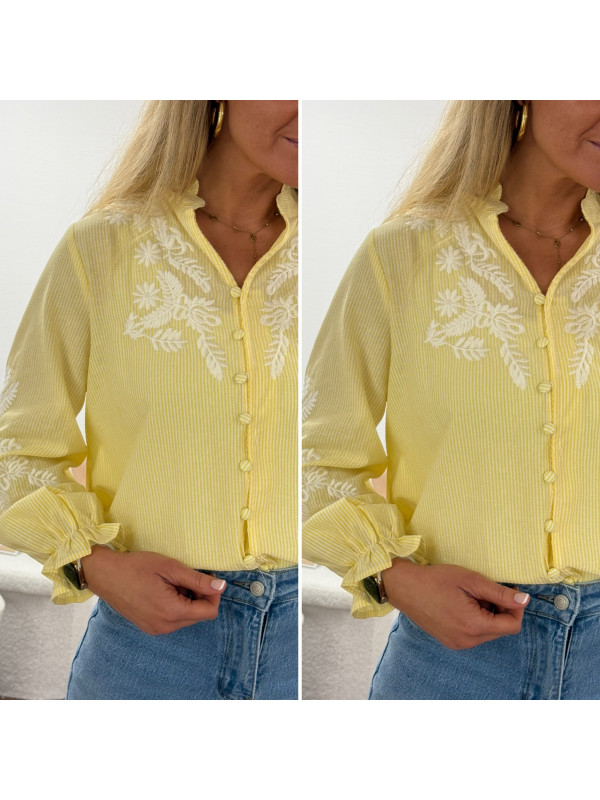 Chemise col V à rayures jaunes et blanches avec broderies blanches sur les manches et la poitrine