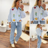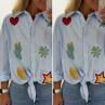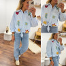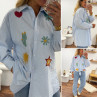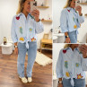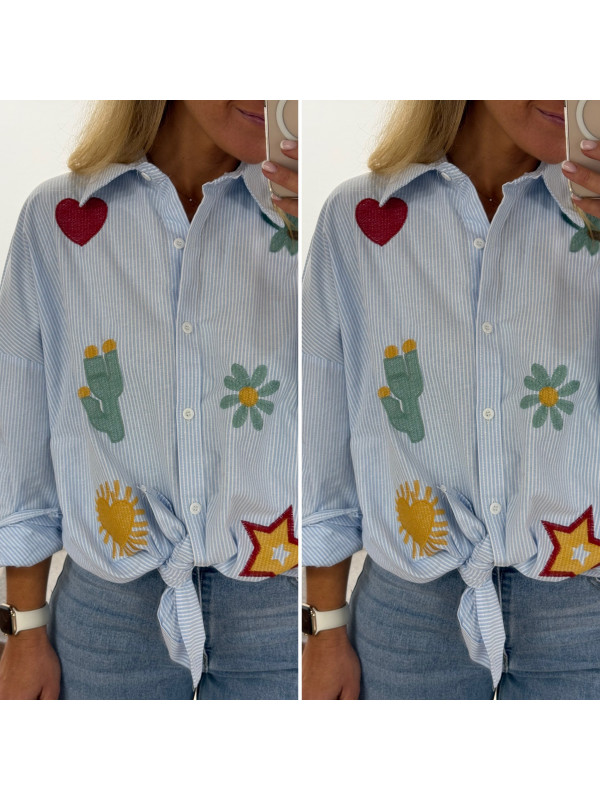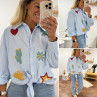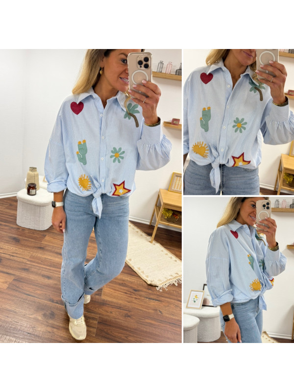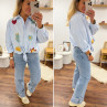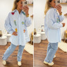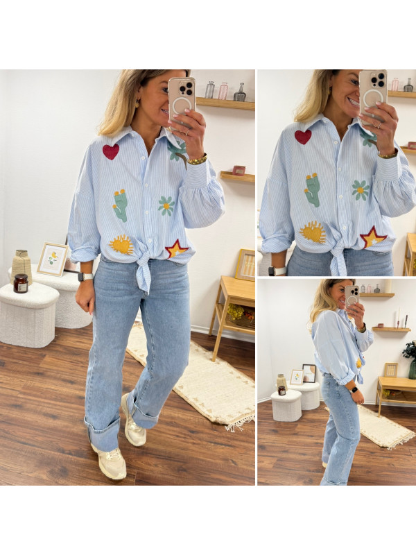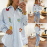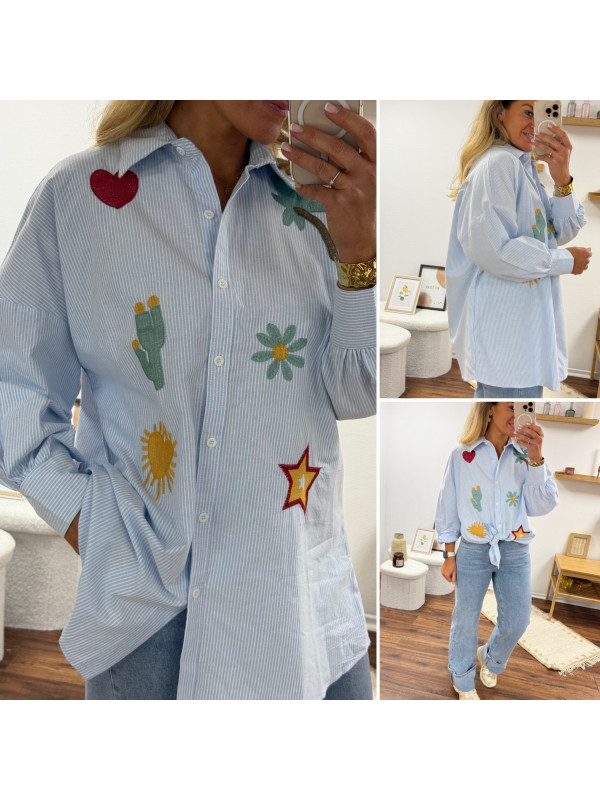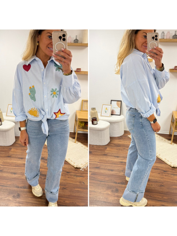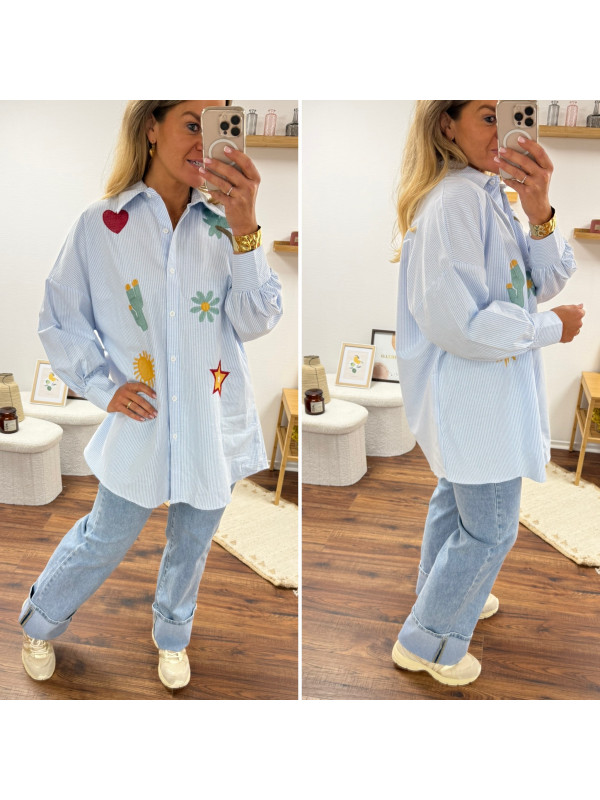 Chemise/tunique mi longue oversize à rayures bleues et blanches avec broderies colorées