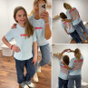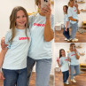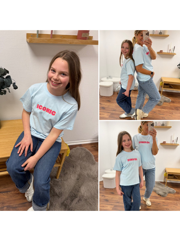 Tee-shirt adulte bleu ciel "iconic" avec écritures roses et oranges fluo dans le dos (uniquement disponible en boutique)