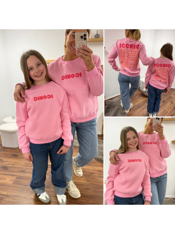 Sweat kids rose avec écritures iconic en rose fluo et orange (uniquement disponible en boutique)