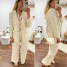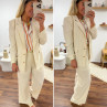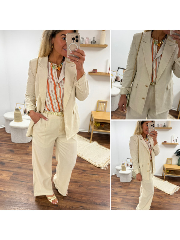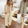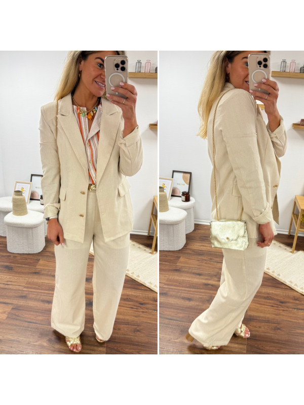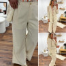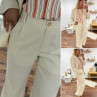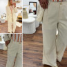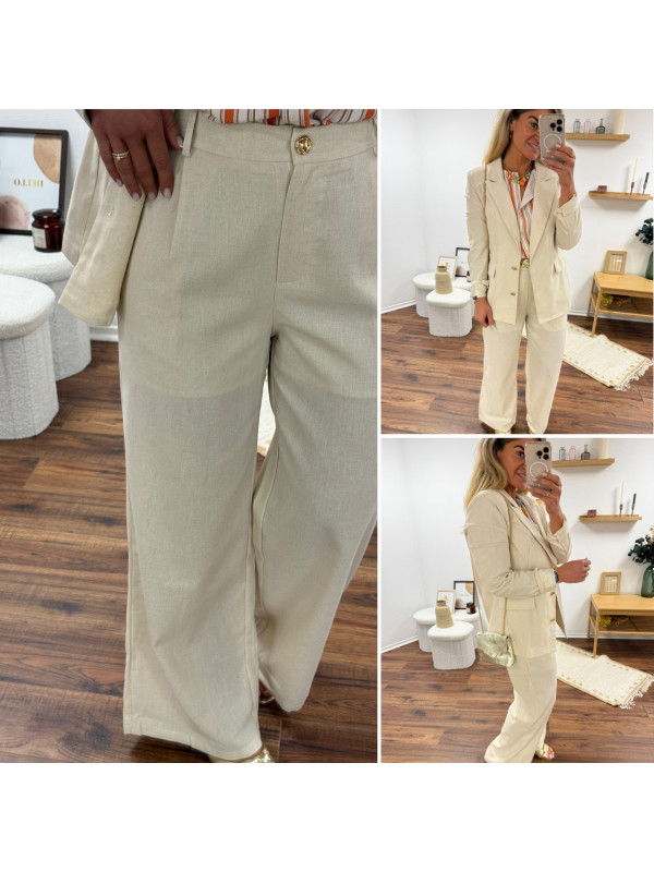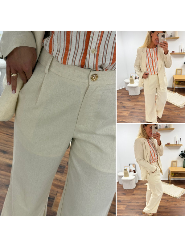 Pantalon fluide droit en lin beige avec bouton doré et taille élastiquée