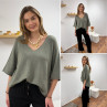 Pull col V kaki clair chiné oversize manches coude