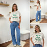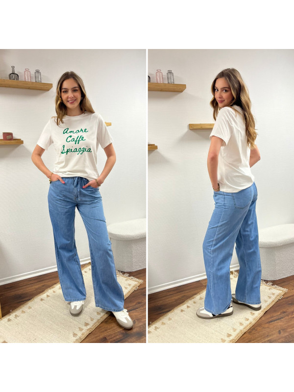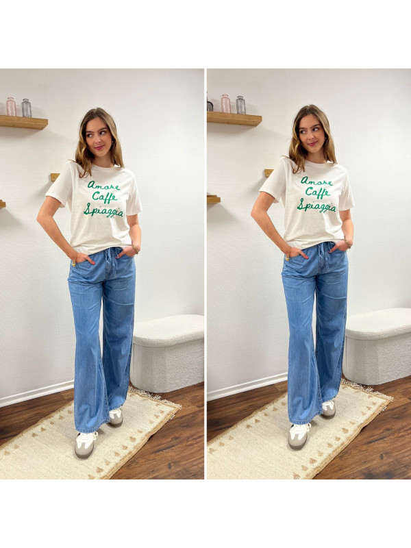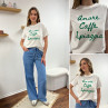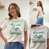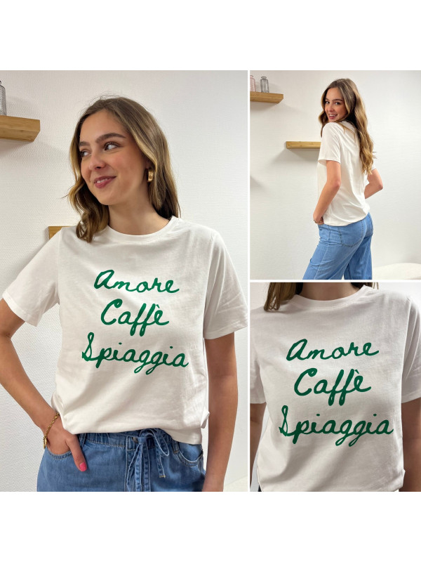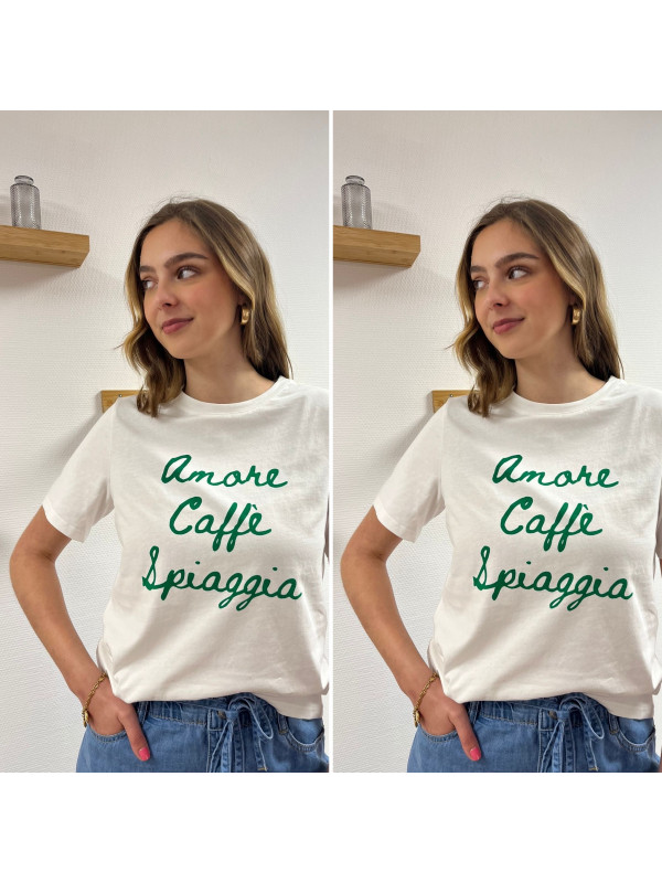 Tee shirt blanc manches courtes écritures vertes "amore caffe spiaggia"