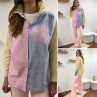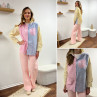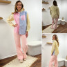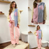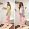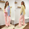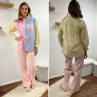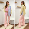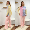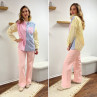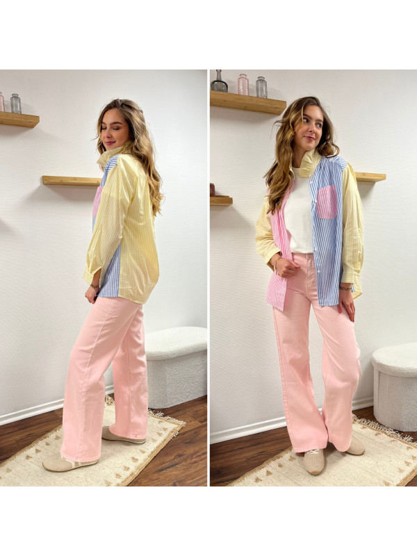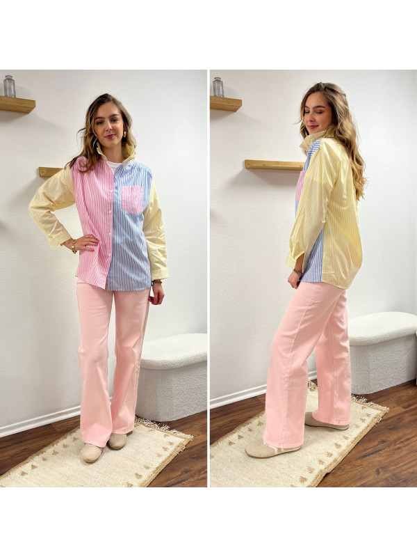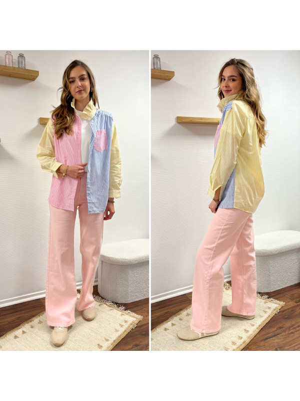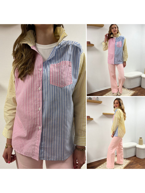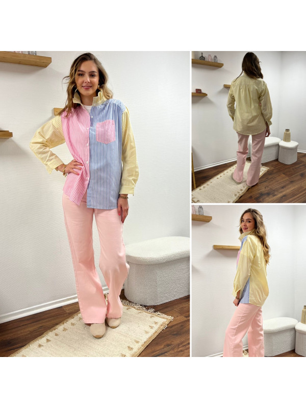 Chemise col volant à rayures bleu ciel, roses et jaunes