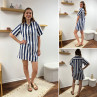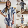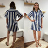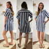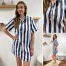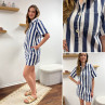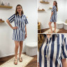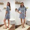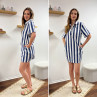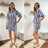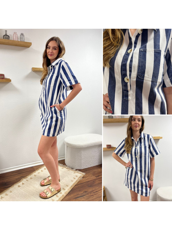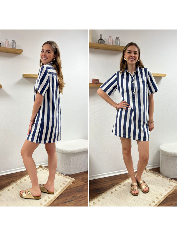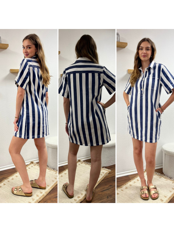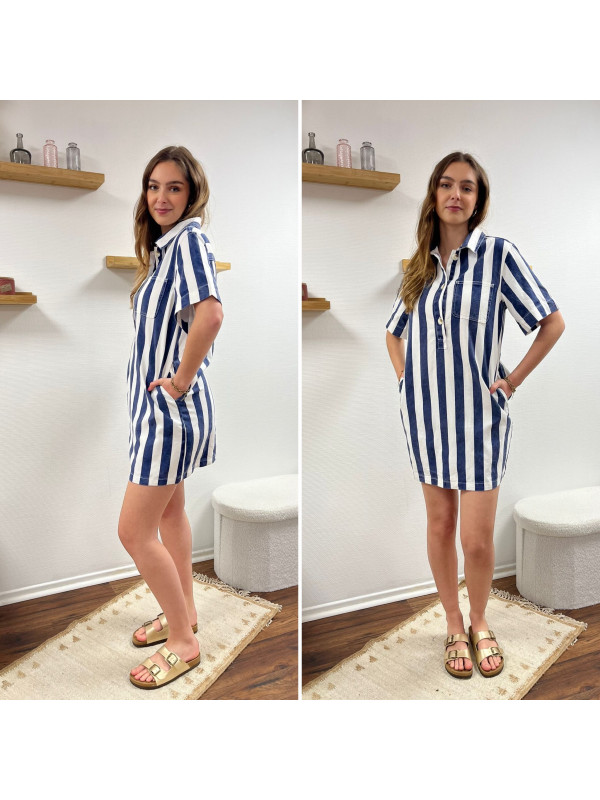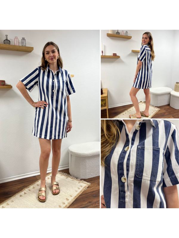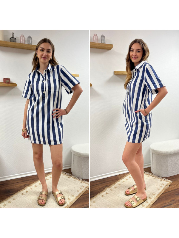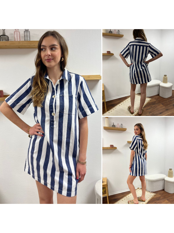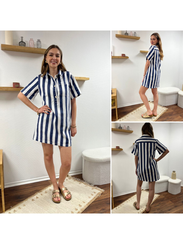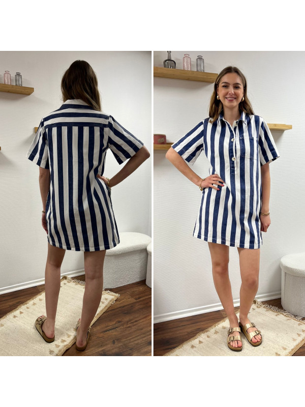 Robe courte en coton avec rayures bleues foncées et blanches avec un col polo