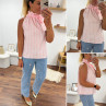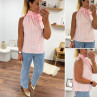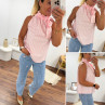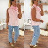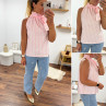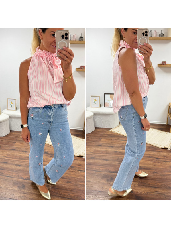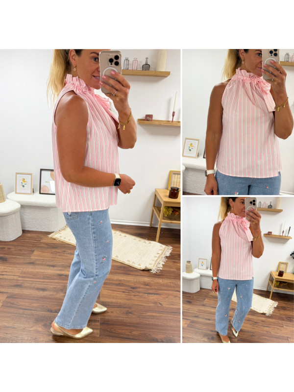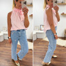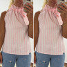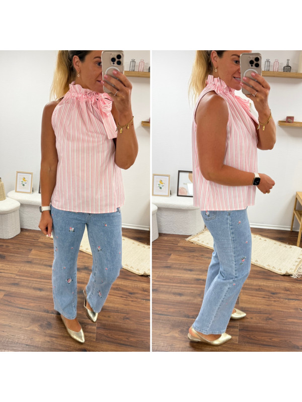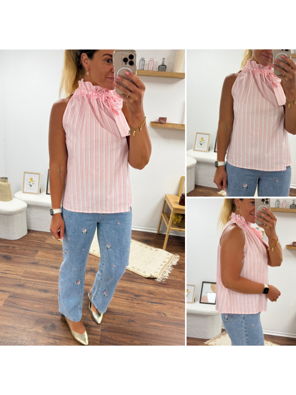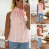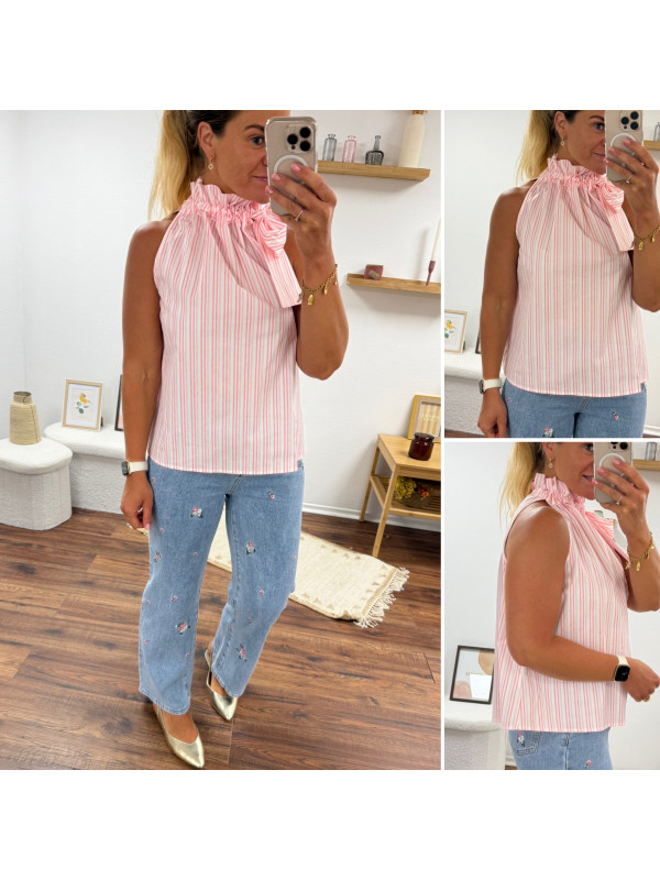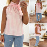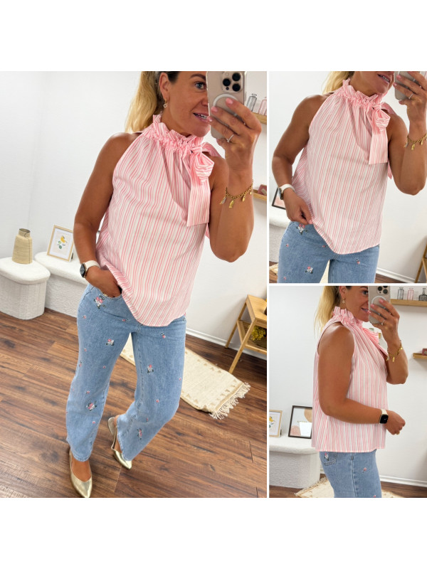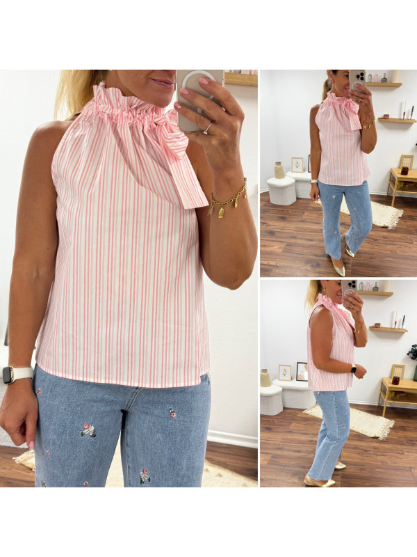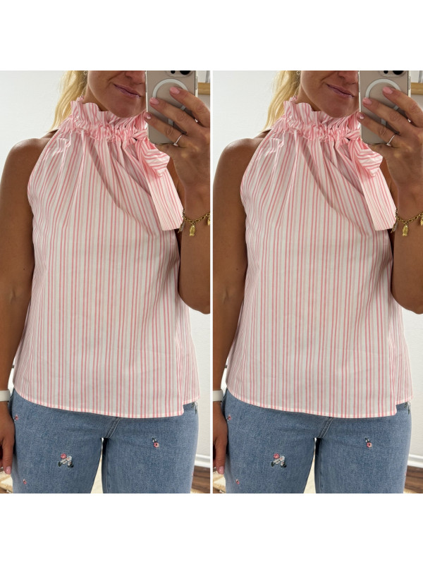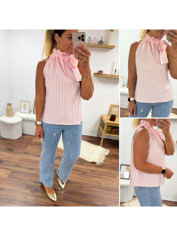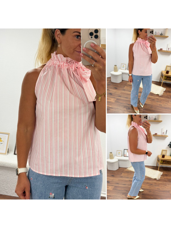 Top blanc à rayures roses avec col resserré par un noeud
