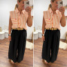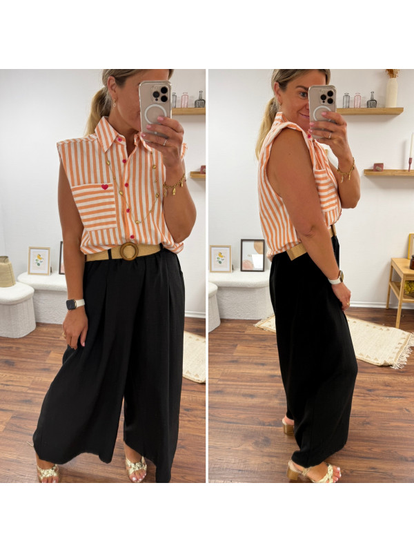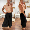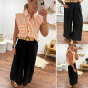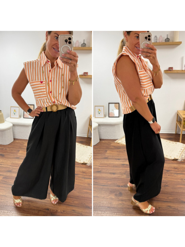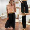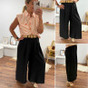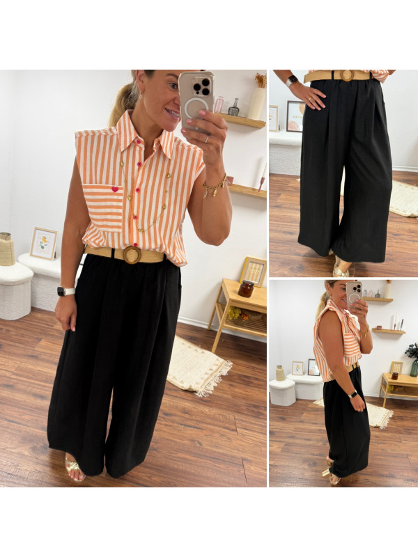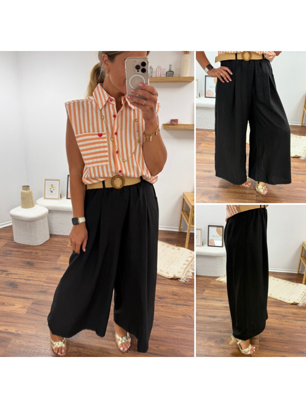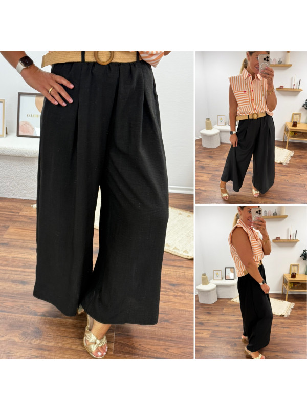 Pantalon fluide très évasé noir avec ceinture boucle ronde effet raphia