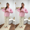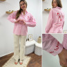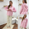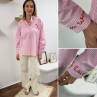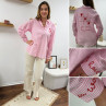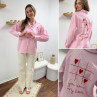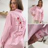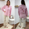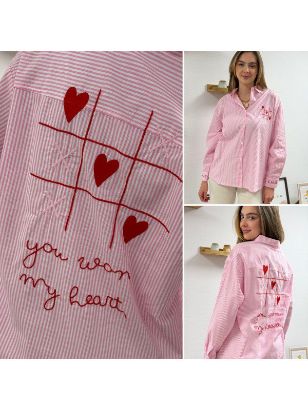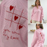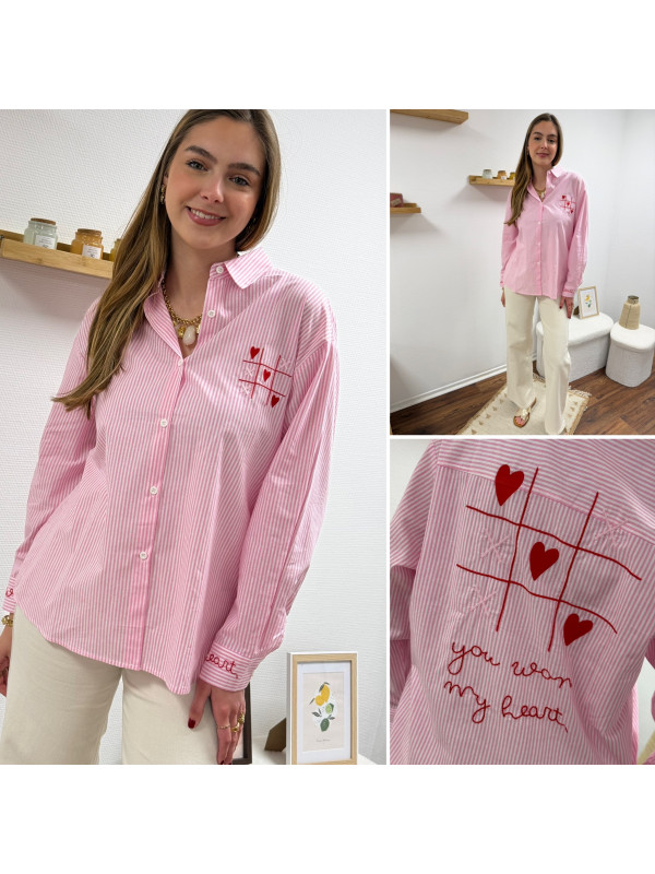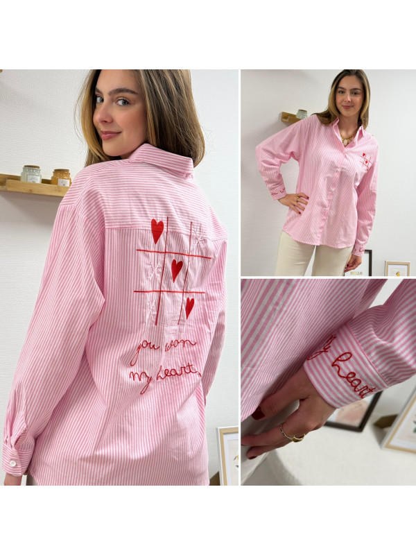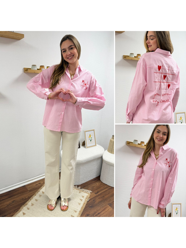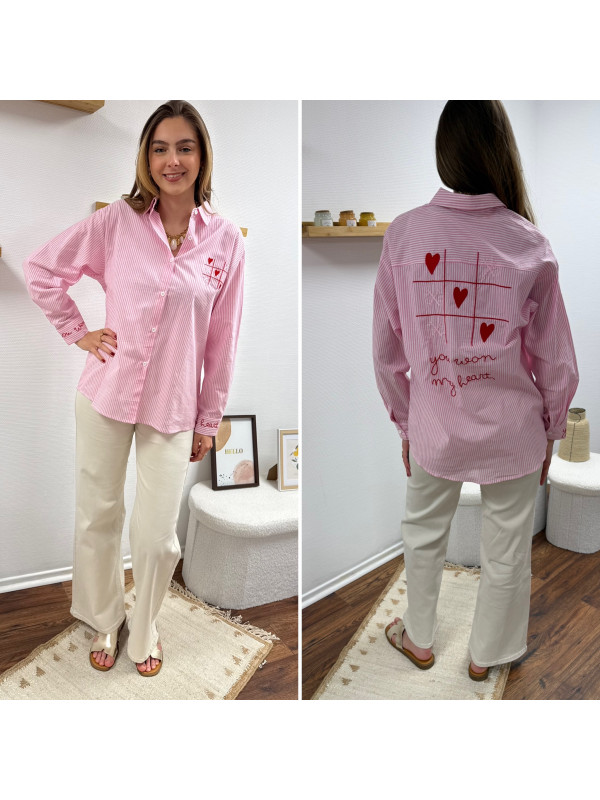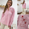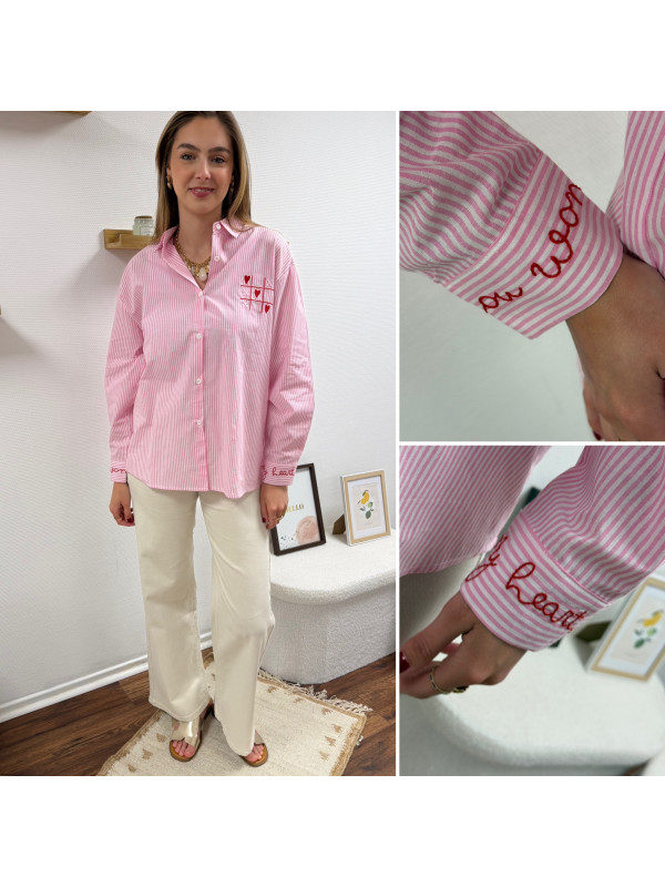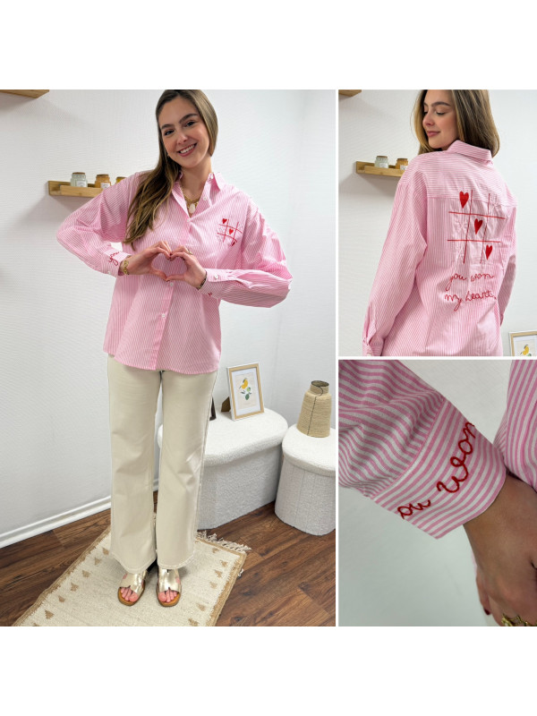 Chemise rose à rayures et cœurs brodés avec inscriptions et dessins dans le dos