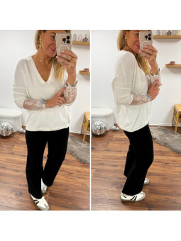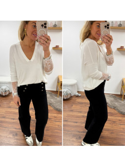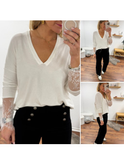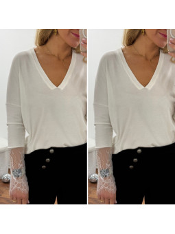 Pull col V blanc avec dentelle aux manches Cet article en TU...